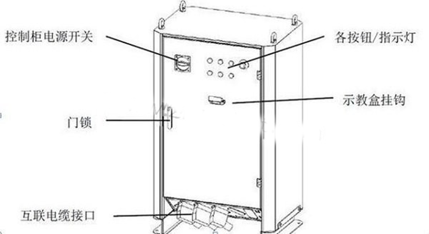 工業機器人控制柜,前面板上有控制柜電源開關、門鎖以及各按鈕/指示燈,示教盒懸掛在按鈕下方的掛鉤上,控制柜底部是互聯電纜接口,例如下圖供工業機器人控制柜示意圖:
